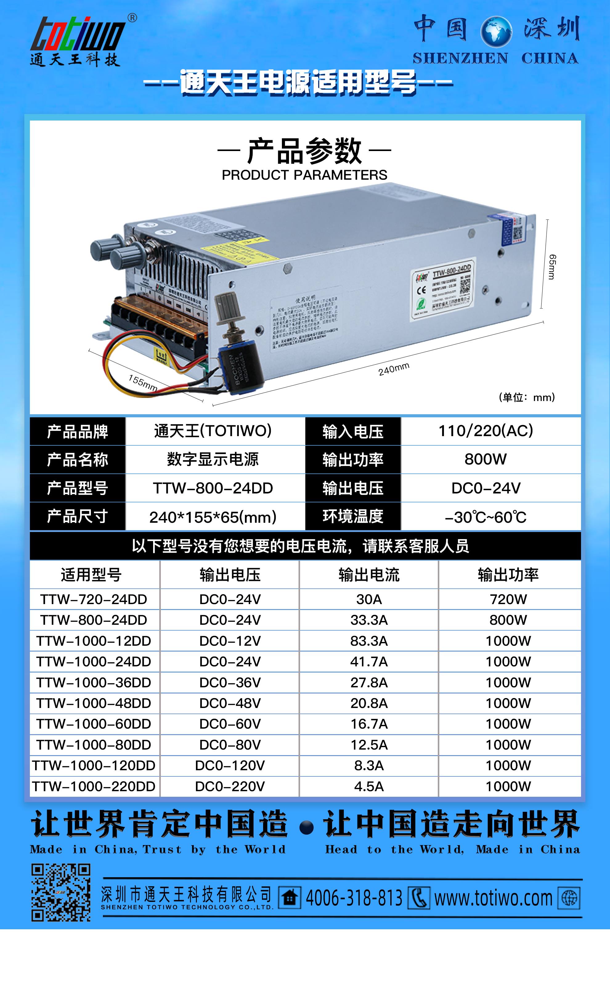本型号采用高密度太空铝外壳,内部电路设计稳定可靠,集中大功率单组输出方案;具有过热保护、过流保护、过压保护、过载保护等多重保护功能;通天王所有系列产品型号均可开增值专用发票,全国五年联保;2014年1月公司顺利地通过ISO9001质量管理体系认证,同时,产品线上多个系列型号产品相继通过CCC、UL、 CE、KC、BS、GS、CB、FCC、SAA、EMC、ROHS和美国六级能效、欧盟六级能效等认证。主要优势功率足、体积小、重量轻、寿命长、价格优、出货快、零售后、智能芯、抗干扰、特稳定、型号全等,是新工业电工电气行业最佳推荐明星产品;安全用电,安心使用,10余年行业经验;通天王-让世界肯定中国造,让中国造走向世界。